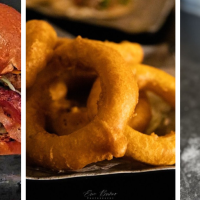 Applewood smoked bacon, aged cheddar, topped with onion rings