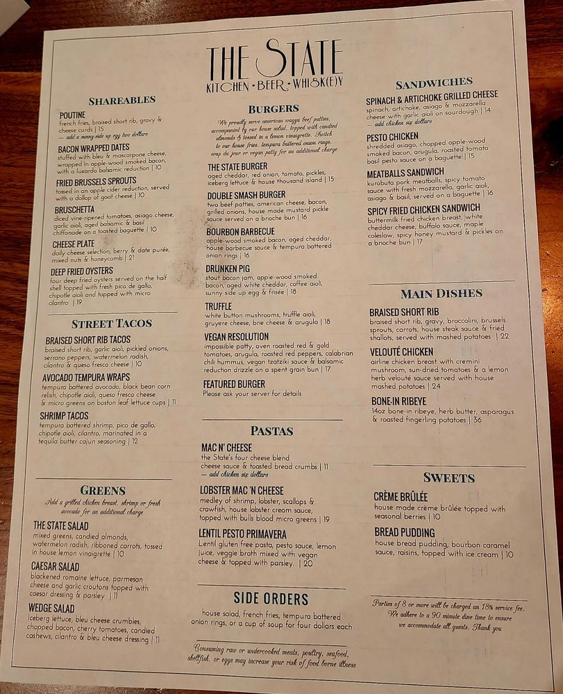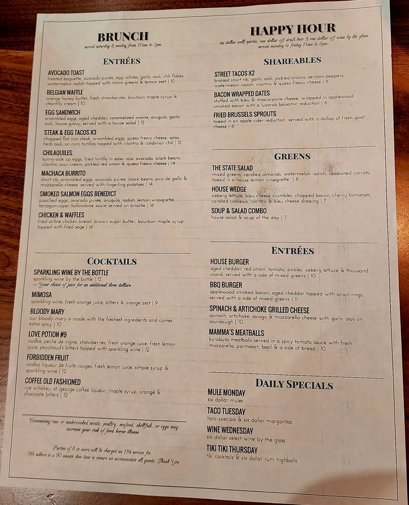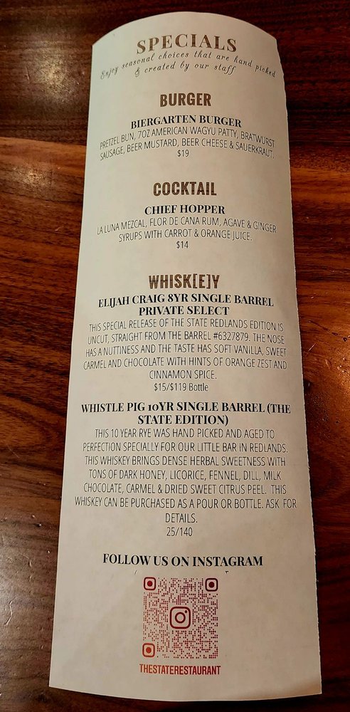 Nestled in the heart of Redlands, CA, The State offers a unique dining experience for whiskey enthusiasts, foodies, and those looking for a trendy yet casual spot to unwind. This gastropub boasts a diverse menu with a focus on New American cuisine, including vegan and vegetarian options. The restaurant is equipped with various amenities such as outdoor seating, private dining, and even a pool table for entertainment. The State prides itself on being inclusive and accessible, with gender-neutral restrooms and ASL proficiency. From the extensive whiskey selection to the delicious dishes and happy hour specials, The State is the perfect place for a night out with friends or a relaxing lunch. With exceptional service and a vibrant atmosphere, this restaurant is sure to leave a lasting impression on all who dine here.