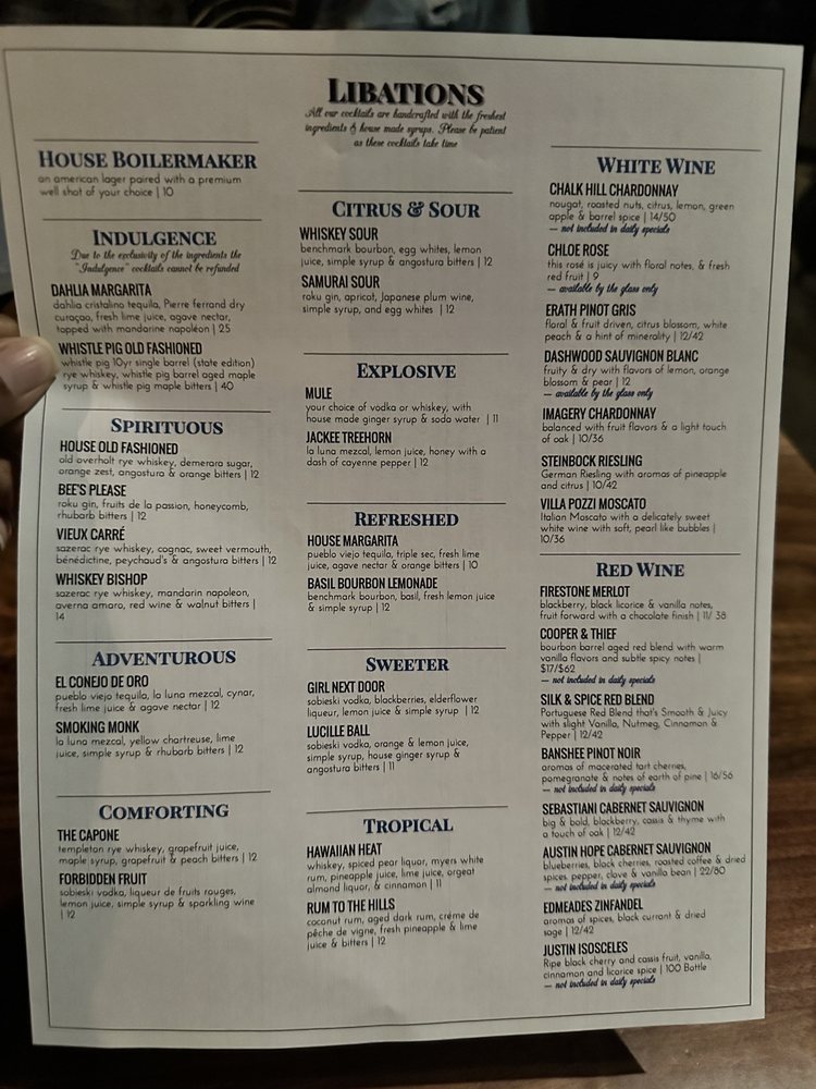 Vodka, coffee liqueur, cold brew, heavy cream, maple syrup, chocolate bitters with a dollop of mascarpone & parliament chocolate